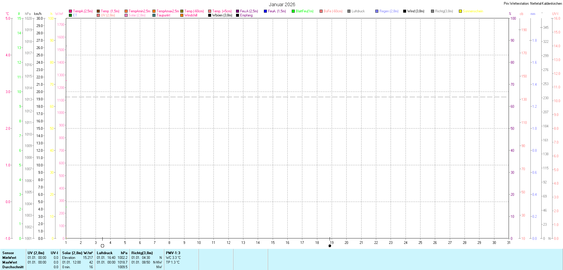 Max.(16:00) (Vorjahr: 0,0 UV-I um 00:00) |